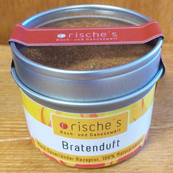rische's „Bratenduft“ bringt mehr Würze und frischen Wind in Ihre Küche. Genießen Sie unsere Vorstellung einer vielseitig einsetzbaren Gewürzzubereitung. All unsere Gewürzmischungen basieren auf unseren eigenen Sauerländer Rezepturen, erprobt in der rische's Testküche und für uns hergestellt in echter Manufakturqualität. Das bedeutet für Sie: