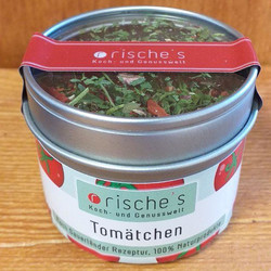 Aromatische Gewürzzubereitung nach Sauerländer Rezeptur. Tomaten sind einfach unverzichtbar beim Kochen und immer wieder lecker! rische's „Tomätchen“ vereint Tomatenflocken, Kräuter und Gewürze zu einer schmackhaften Mischung.